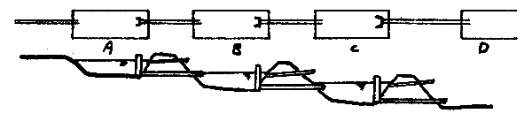 Les étangs en série n ont pas de prise d'eau indépendant. Les bassins se trouvent l'un en dessous de l'autre. L'eàu parcount d'abord tous les bassins qui se trouvent l'un en dessous de l'autre. L'eau parcourt d'abord tous les bassins A, B et C situés plus haut avant d'arriver dans le dernier bassin D.