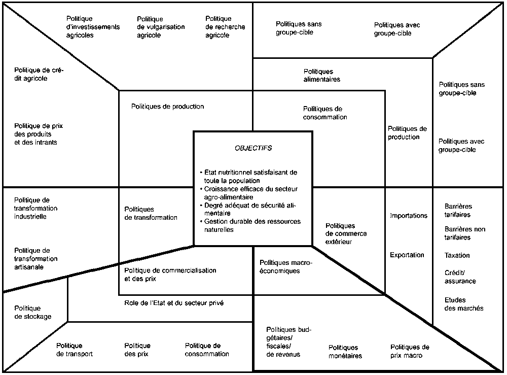 Il ressort clairement que la notion de sécurité alimentaire peut être abordée de plusieurs manières et quil sagit dun concept multidisciplinaire qui inclut des dimensions techniques, économiques, sociales, culturelles et politiques. La sécurité alimentaire universelle, telle que recommandée lors du Sommet mondial de la FAO, supposerait de mettre en uvre simultanément lensemble de ces mesures dans la cohérence. Enfin, il est important de replacer le concept de sécurité alimentaire dans celui, plus large, de stratégie alimentaire, elle-même partie dune stratégie de développement socio-économique. La figure 1 rappelle les principales composantes dune stratégie alimentaire répondant à des objectifs et réclamant des politiques macroéconomiques et des politiques sectorielles (GHERSI et MARTIN, 1996). (Voir figure 1).