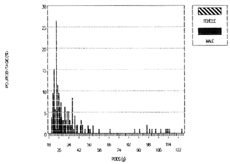 Ces graphiques montrent une grande variation de poids des crevettes, surtout les femelles. Ceci est confirmé par le calcul du coefficient de variation qui est de 60 % pour les femelles et 24 % pour les mâles.