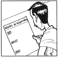![]() | Les affiches de commande qui sont distribuées pour l'inscription du nombre d'alevins voulu et celles de vente avec des renseignements sur le lieu, la date, l'heure de la vente et le prix sont aussi considérées comme du matériel de sensibilisation. |