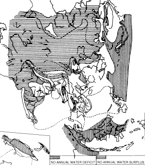 1. The Asia-Pacific region comprising 35 countries stretches east west from Iran to Cook Islands and north south from Mongolia to New Zealand. The Indian Ocean provides moisture for the summer monsoon over the southwestern area, while the China Sea, Gulf of Siam and Bay of Bengal are the main sources of water for the winter monsoon, which affects the northeastern region. Northwest India and much of Pakistan are extremely dry and receive limited rainfall annually. The desert and semi-arid conditions found here are in marked contrast to the tropical areas of coastal India, Sri Lanka and Bangladesh where annual rainfalls range from 1,000 to 2,000 mm. The wettest terrain is found in Southeast Asia and the Pacific region where rains are abundant. On a national basis, most Asian countries receive an annual rainfall of between 1,000 and 4,000 mm. Its seasonal pattern can be classified into (i) a single rainy season, (ii) two rainy seasons, and (iii) uniform seasonal rain with no distinct wet season. A composite map of water balance for Asia (Isamu Kayane, 1971) shows that except for Indonesia, Malaysia, Central China, and Japan, all other countries in the region have a distinct dry season (Figure 1). Agricultural productivity throughout the region is strongly related to variations in precipitation.
