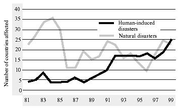 2. Although much has been learnt from experience in how to predict most types of disasters and new technologies are raising the lead time for the issuance of warnings of adverse weather events, there has been an alarming increase in the number of countries affected by disasters. This trend appears to have been linked to a rise in the scale of damage. Much of the increase has been in countries affected by natural disasters (rising from 10 to 18 per year between 1996 and today). The most alarming trend is however in the steep increase in the number of countries affected by man-made disasters which have risen from an average of 5 in the 1980s to 22 in 2000, mainly due to conflict. Emergency situations with important social and economic repercussions are also created by the spread of plant and animal diseases, as well as by human diseases such as HIV/AIDS.