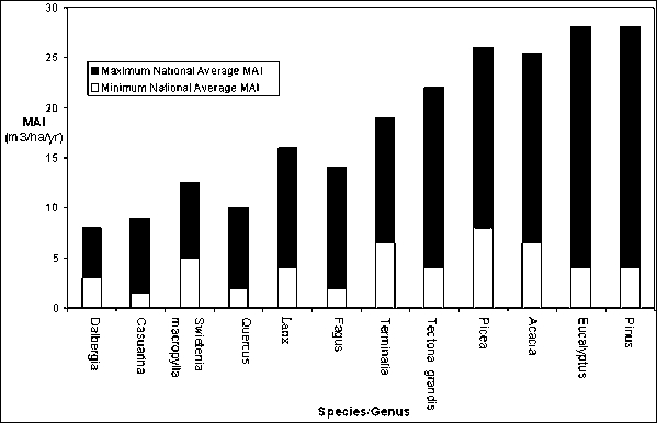 Primary source: Leech (1998)Figure 3 shows a cross-section of estimated minimum and maximum yields, at a national scale, for major plantation species and genera. Thus the mean annual increment (MAI) for Pinus species plantations ranges from 3 m3/yr in some Scandinavian countries, to 24 m3/yr in New Zealand. Initiatives such as the Tree Growth Potential Information System (TROPIS)[1] and the Sistema de Manejo de Informacion sobre Recursos Arboreos (MIRA)[2] are making significant improvements to the availability and quality of growth and yield data, as well as the efficiency of research (see also Working Paper FP/1).