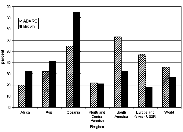 Figure 4 shows regional estimates of proportionate contribution of plantation wood to regional wood supply made by FAO and ABARE/Jaakko Poyry. There are significant differences in the estimates, partially because significantly different base data has been used in the modelling process, and because the modelling techniques used are also considerably different. As noted above, use of age-class data as a basis for modelling adds a timing dimension to the FAO estimates. Thus, the relatively high proportion of immature plantation forests mean the FAO estimates will be, ceterus paribus, generally lower than the ABARE/Jaakko Poyry estimates, although not in the case of Oceania. Other significant differences in the estimates result mainly from the base plantation area estimates used. In comparison with the FAO data, the ABARE/Jaakko Poyry estimate uses significantly higher estimates of plantation areas for Europe and South America, and significantly lower estimates for Asia and Africa. Assumptions on mean annual increments and rotation lengths have significant, but lesser, effects on the estimates.