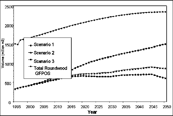 FAO, 2000Figure 5 compares future wood production to 2050 from industrial plantations under each of the three scenarios to forecast industrial roundwood consumption, derived using long-term trend analysis. Several points of interest can be noted from Figure 5.