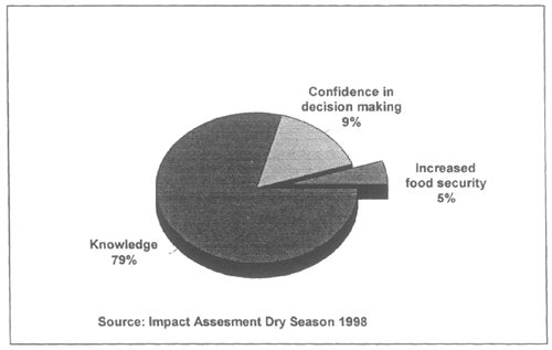 Participation plays a key role in demonstrating the acceptance of beneficiaries of the proposed activities as well as the willingness of their involvement in the long run. SPFS has been found to provide sufficient power to the community to judge on its implementation. So far villagers are satisfied with the results obtained from both dry and rainy season activities in 1998. Problems faced by most villagers have been tackled during the IFFS and this contributes to better food production in the short as well as the long run. Villagers are stimulated to think about their own resources and to take decisions regarding future problems.