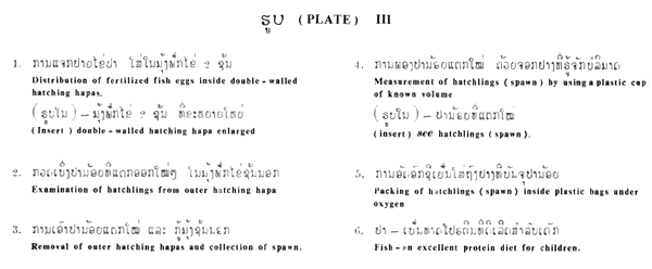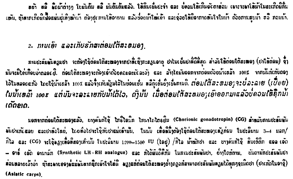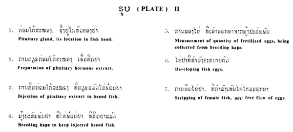 This extension pamphlet is produced to educate many more Lao technicians and farmers in the technique of fish seed production. The method of induced breeding of carps is described in detail and the essential requirements for the fish seed production programme are listed.