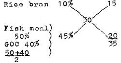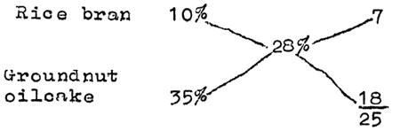 If more than two feed stuffs are used in a feed, they may be grouped into basal feeds (CP 20%) and protein supplements (CP 20%) averaged within each group, and plugged into the square method (Crude protein level of fish meal 50%, rice bran 10% and groundnut oilcake 40%).