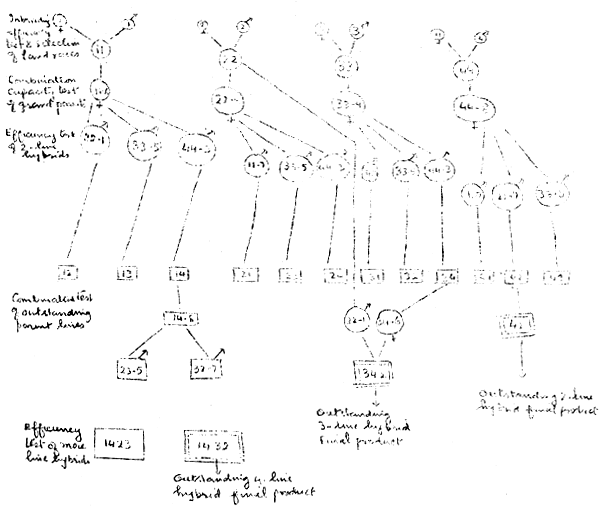 As the number of tested combination increases, the possibility of finding a new, best combination becomes small and further improvement requires selection for combining ability within the best parental line. This requirement is met in the recurrent selection (RS) and reciprocal recurrent selection (RRS). The basic feature of the above selection procedures that differentiates them from other selection procedure is that the pure bred parents are selected on the basis of the performance of their cross-bred half-sibs rather than on the basis of their own performance (Fig. 6).