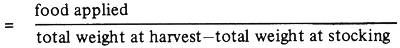 Bean cake powder, 10 per cent; pupae, 10 per cent; barley flour, 30 per cent; rapeseed cake, 50 per cent; bone powder, 2 per cent; table salt, 1 per cent. The crude protein content is 28.1 per cent and the carbohydrate content is 38.9 per cent. The food conversion ratio for 2-year-old black carp in monoculture is 2.4.