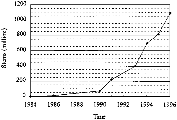 Fig. 1. The commercial production of cut flowers in China during the period from 1984 to 1996.