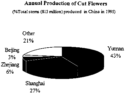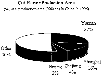 In 1996, the production area under cut flowers was about 3,000 ha and the yield was 1.09 billion stems. The major areas where cut flowers are grown commercially are Yunnan, Shanghai, Sichuan, Zhejiang, Guangdong, and Beijing. The production-acreage in Yunnan, Shanghai, Zhejiang and Beijing accounts for about 50% of the total acreage in China (Fig. 3). The annual production of cut flowers in these four regions accounts for about 79% of the total production in the country (Fig. 4).