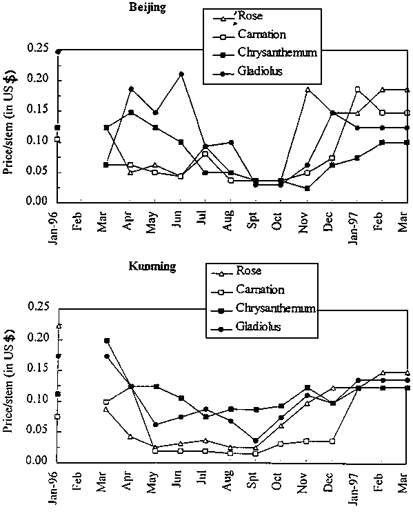 It is inferred from the analysis of the whole-sale prices of rose, carnation, chrysanthemum and gladiolus in the Beijing and Kunming markets during the period from January 1996 to March 1997 (Fig. 5) that these cut flowers were cheaper during the period from May to October than during the period from November to April. It is also obvious that the average wholesale price in Beijing is higher than that in Kunming. Yunnan supplies fresh cut flowers to more than 20 other regions such as Beijing, Guangzhou and Shanghai.