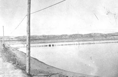 Dés la fin du mois de Septembre, on a procédé à des mises sous eau de faible épaisseur (10 – 15 cm) suivies d'asseos successifs à quinze jours d'intervalle, tant pour lessiver le fond que pour provoquer la poussée d'algues, si bien qu'en Novembre le bassin était “conditionné” pour recevoir une mise en charge.