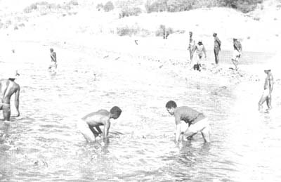 Ils démontrent cependert que les Chanos pesant 400 gr. en Mars, ont doublé de poids en 45 j. Le filet maillant à larges mailles utilisé pour ce contrôle a donné un échantillon sélectif des plus beaux sujets. Il est évident que les poissons de plus petite taille ont échappé á cette investigation. Tous les poissons capturés avaient l'estomac et l'intestin “bourré”, le ventre rond et gras : visiblement la population Chanos disposait de nourriture (algues uniquement) àvolonté. |