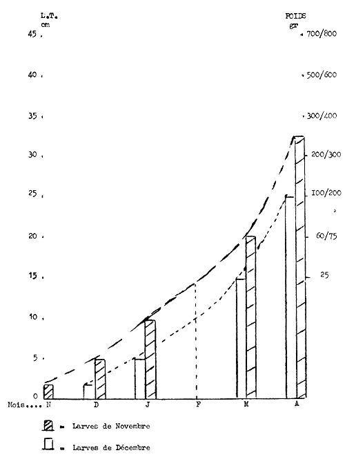 A l'issue de ces premières pêches de contrôle concernant des échantillons de même génération (issus des larves de fin Novembre), on notera que l'échantillon provenant du milieu naturel pesait 85 gr, celui du bassin - témoin des Salines, 70 gr, et celui du bassin expérimental, 62 gr.