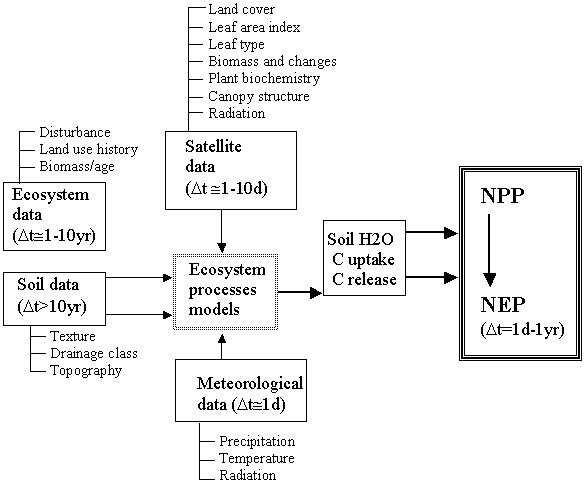 There is no present capability to estimate the size of the terrestrial carbon sources and sinks frequently and over larger areas. Its importance was recognised in the early IPCC discussions but neither the techniques nor institutional arrangements were available. However, the rapid progress over the last 10 years in the methods for measuring and computing the pools and fluxes of terrestrial carbon makes it possible to propose a major new initiative in this area. In technical terms, the above information gaps translate primarily into the need to obtain the spatial distribution of net primary productivity (NPP) and net ecosystem productivity (NEP), both measured as mass of carbon per unit area per year. NPP is the carbon assimilated by vegetation through photosynthesis, minus the carbon lost because of respiration (i.e. breathing) by the living plant tissue. NEP is the difference between NPP and the loss through a decay of organic matter (above or below ground). In addition, fire and other disturbances, and land use (e.g. cropping, grazing and silviculture) are important in determining long-term carbon retention by ecosystems, i.e. their net biome productivity (NBP). Therefore, determining the spatial and temporal characteristics of NPP, NEP and NBP are priority issues for TCI.