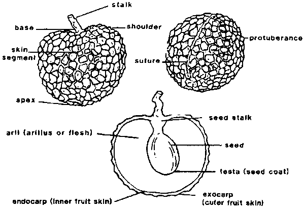 Fruit are highly variable, depending on the cultivar (Figure 3). They can be round, ovoid or heart-shaped, and from 2.0 to 3.5 cm in diameter. The skin can be smooth or rough with distinct protuberances, thick or thin, and pink-red, bright red or purple-red. The flesh or aril is an outgrowth of the outer cells of the seed coat (outer integument), and in good cultivars may comprise 80 percent of fruit weight. The aril is generally translucent white, juicy or firm, and sweet and aromatic in better cultivars. Many cultivars can be distinguished by their flavour and aroma. The fruit contain a single dark brown seed 6 to 12 mm wide and 10 to 23 mm long. Some cultivars have a high proportion of aborted seeds and thus a high flesh recovery. They are popular in the market-place, especially in Asia. There are a few cultivars that produce nearly seedless fruit, although the fruit usually weigh less than 10 g.