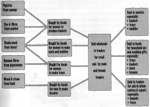 To get information on participants' knowledge of market transparency, people were asked to draw the marketing chain for products included in the MIS. By comparing the diagrams to those that had been made during the assessment step of the MIS, it was easy to see how knowledge of the market had changed. The market chain diagrams of project participants also were compared to diagrams drawn by handicraft traders who were not part of the MIS. These techniques permitted both before/after comparisons and participant/nonparticipant comparisons.