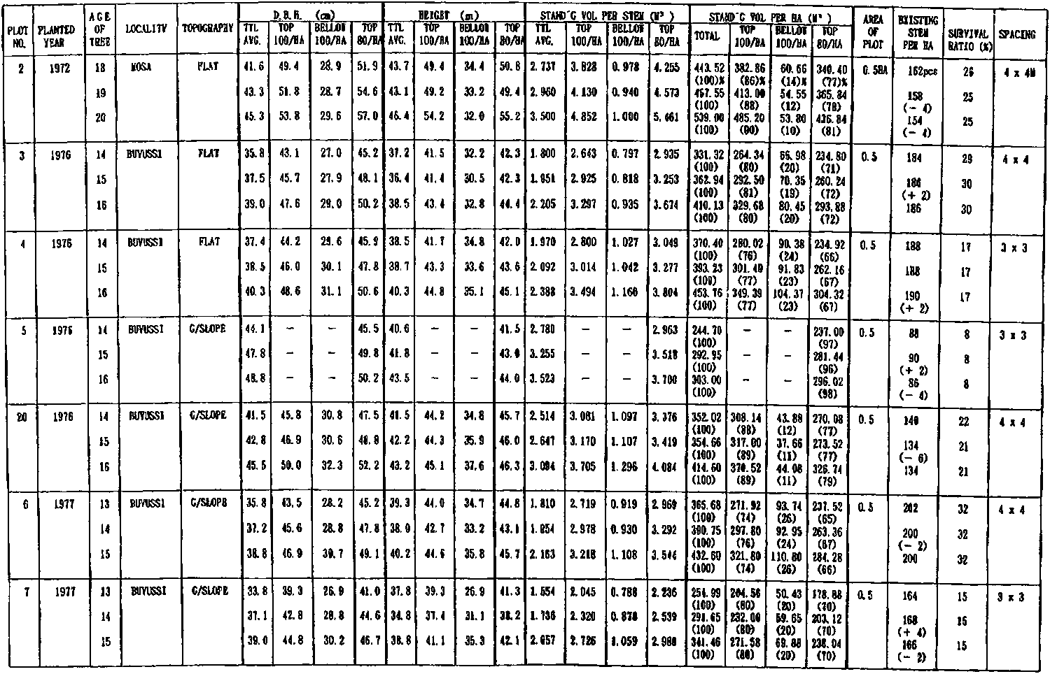 The reforestation work as the first experimental phase began in 1975 and continued until 1978 with establishing 255 ha of kamerere. Subsequently in 1981, the other three species were added. Sample plots to observe growth and other factors were established in 1982. The detail field record of kamerere is attached in Annex I, because this is only one Eucalyptus species among others. However, their growth records are summarized in Figure 2, and estimated sizes and yields by the end of each cutting cycle are shown in Figure 3.