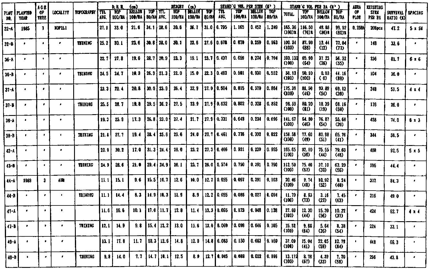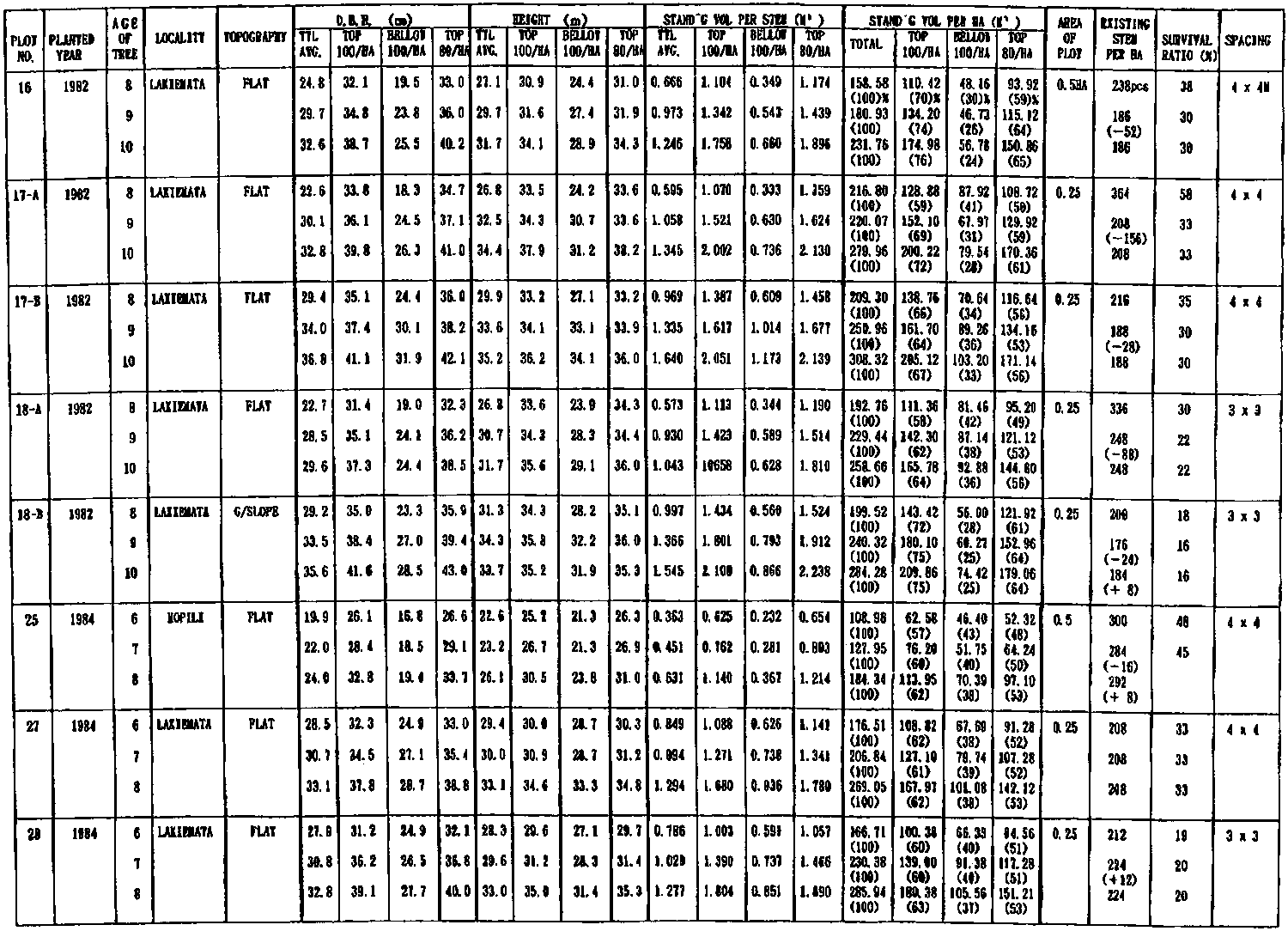 The volume recovered from the reforestation area is ten times higher than that of the natural forest. Logging cycle was approximately half that for the selective cutting applied in the natural forest. It should be, however, noted that these plantations were established in a volcanic ash soil area in the tropical rain forests of the island. It is assumed that there was no constraint in soil fertility.