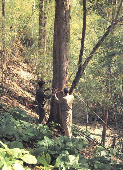 The management of teak forests under the Brandis Selection System started in 1896; a felling cycle of 30 years with a prescribed girth limit (gbh) of 213 cm was adopted in 1939. In this system, teak forest was broadly divided into two blocks (i.e., logging or opened, and non-logging or closed blocks). The logging block was subdivided into 5 (3 (i.e., 5 compartments and 3 felling series plots) for 15 years logging operations and concession. In 1953, the concession was revised and the overall teak forest was divided into 40 working plan units. Each unit was then subdivided into 30 felling series for a 30 year logging operation and concession. However, all teak logging operations and concessions were terminated in 1983. Only improvement fellings are permitted in the natural teak forests (Kaosa-ard, 1991).