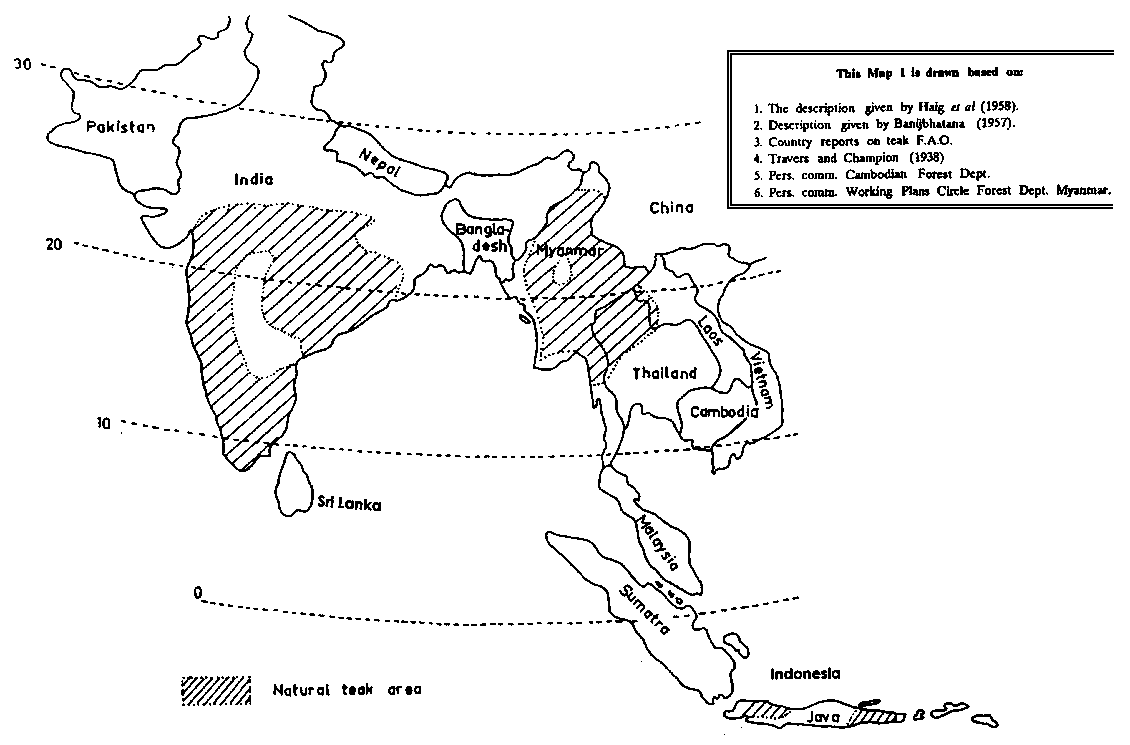 Teak is indigenous to the South and Southeast Asian countries of India, Myanmar, Lao PDR, and Thailand. The species is also well established in Indonesia on the islands of Java and Muna, but it is not clear whether this occurrence is natural or results from an introduction by Hindus in the seventh century (Howard, 1948; Letourneux, 1957; and Van Alphen De Veer, 1957).