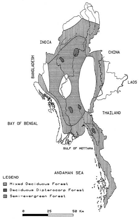 The forests in Myanmar are classified into six major forest types. Natural teak distribution occurs in the semi-evergreen forests, mixed deciduous forests and deciduous dipterocarp or Indaing forests. These forest types with their sub-divisions are given below.