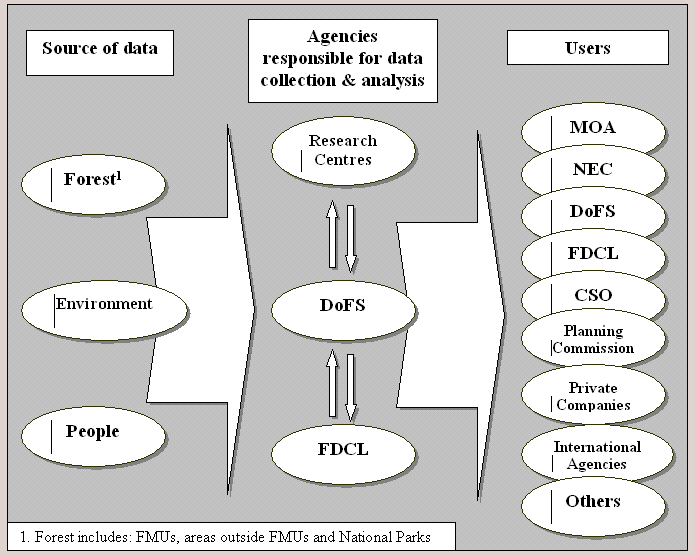 The field offices of DoFS collect information from (i) FMUs (ii) forest areas presently outside the FMUs (iii) National Parks and Wildlife Sanctuaries and (iv) people involved in community and social forestry programs. Data comprising timber production from FMUs and timber sales are also received from FDLC. From DoFS, the information is passed to the Ministry of Agriculture and other interested organisations. The flows of information are shown in Figure3.