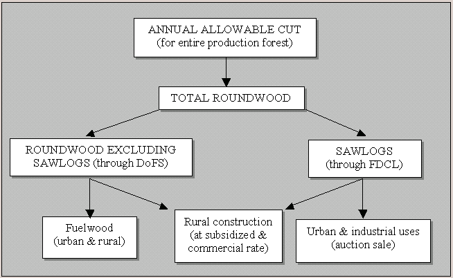 Although policy allowing timber production from community and private forests has been issued, as detailed below, all present supply is from Government Forests Reserves (i.e. forest areas within and presently outside the FMU system). Commercial roundwood (sawlogs) is supplied from FMU areas exclusively by the FDCL, whereas other, non-commercial, roundwood is supplied under supervision of the Territorial Divisions of the DoFS from areas currently outside the FMU system (Figure 4).