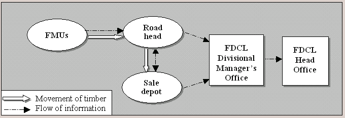 Data on the quantity of timber produced is collected and compiled by FMUs and submitted at monthly intervals to the Divisional Manager’s office. The Divisional Manager's office also receives information from the sale depots. The two sets of information are then compiled and sent to the FDCL head office for further compilation and analysis (Figure 5). No specific statistical software has been developed for data analysis although there is a proposal to link the FDCL database to the National Database at the Ministry of Agriculture in the near future.