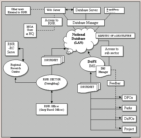 The data collected by the geog-based offices of the Ministry will be entered and stored in the Dzongkhag RNR sector database. Data access and analysis will also be done at this level. The data will then be electronically transferred to the National Database, either by e-mail, diskette or compact disc. The data may, if required, also be transferred to Regional Research Centres for storage and access. The National database will be accessible through web-based interfaces.