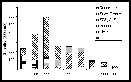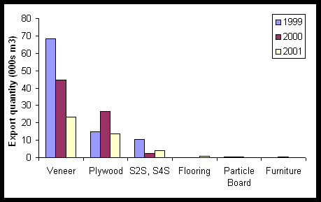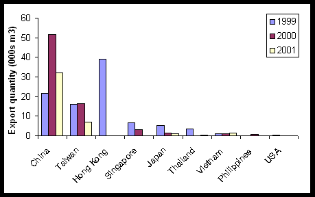 Markets for Cambodian forest products do not show great stability (Table 6, Figure 2 and Figure 3). They may vary according to free market trends or political decision of the RGC based on investment policy. In 1999, Hong Kong was the largest importer of forest products with a total figure of approximately 39,100 m3 or 42 percent of all processed forest products exported. In 2000 and 2001, the largest importer was China followed by Taiwan.