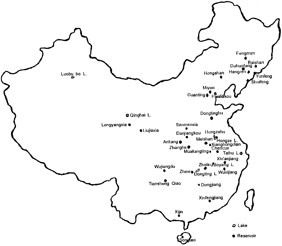 Fig. 3. Major lakes and reservoirs (with storage capacity exceeding 2 billion m3) of China.