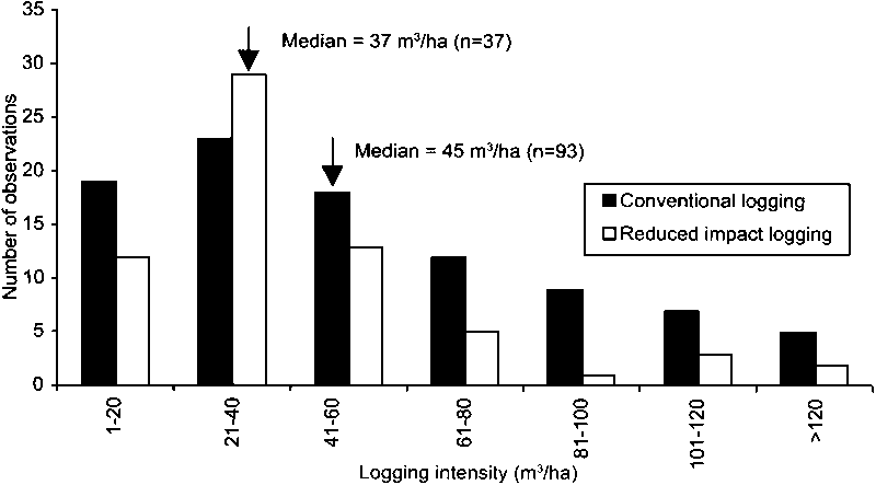 Figure 3 is a summary of 130 observations (n=37 for RIL and n=93 for CL). The median[12] volume harvested was 8 m3/ha lower, with RIL at 37 m3/ha and CL at 45 m3/ha. In the majority of the RIL studies the logging intensity was <60 m3/ha, while for CL there was a significant portion >60 m3/ha.