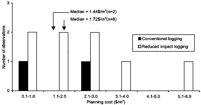 Figure 5 summarizes the findings on planning costs per cubic metre. In 10 observations the median cost of RIL was US$ 0.28/m3 higher than that of CL. In another two observations the planning costs were reported as costs per hectare. The range of US$ 5.06 to US$ 50.00/m3 indicates serious shortcomings in the statistics on planning at this time.