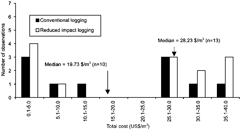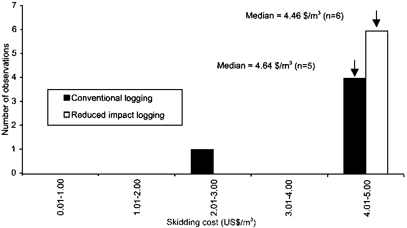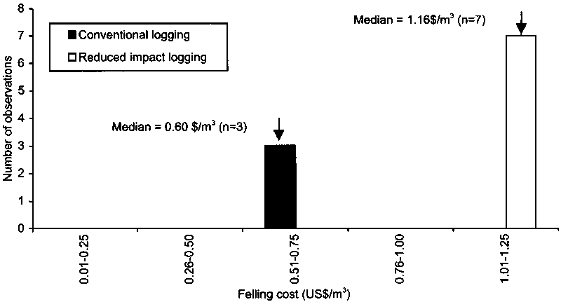 In a total of 10 observations, the median felling cost of RIL was US$ 0.56/m3 higher than that of CL. This represents a cost that is 48 percent higher.