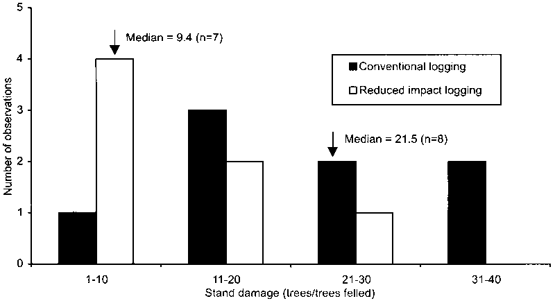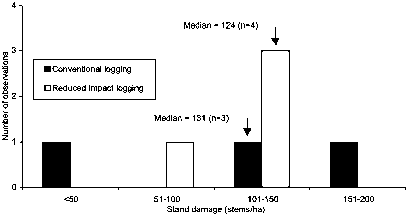 Other studies (Figure 10), which measured stand damage in a different manner (a total of seven observations), found that median rates of damage for RIL and CL were 124 and 131 trees per hectare, respectively.