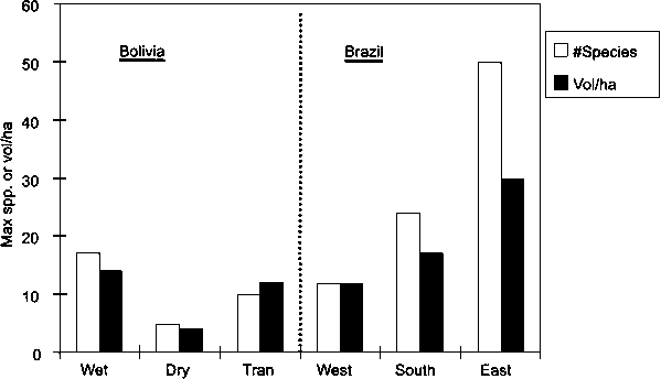 The information presented here is based on our collective field experience and open-ended interviews with individuals working in the forest sector in each country. We interviewed 12 people in Brazil (including four company owners and three foresters) and 13 in Bolivia (including four company foresters). The four Bolivian companies[31] hold concessions - located in all three principal forest types (dry, transitional and wet forest) - covering about one million hectares. The area represented by the seven Brazilian companies[32] interviewed is about 800 000 ha.