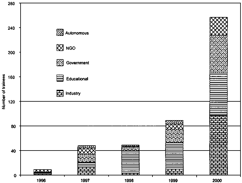 The lack of trained and qualified people at all levels in the forestry sector, from chainsaw operators to marketing departments, is perhaps the biggest impediment to RIL adoption in both countries. Although numerous training courses have been held and a substantial number of individuals have been trained at all levels, there is still a major need for further activity. For example, in Brazil FFT has provided RIL training or technical assistance to nearly 300 technicians and foresters from 1995 to 2000 (Figure 2), but has had to turn away many individuals due to limited space in courses (FFT, 2000). As more companies become convinced of the benefits and cost-effectiveness of RIL, demand for qualified human resources will only increase.