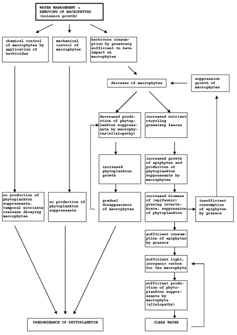Summary: Control measures against "nuisance" growth are risky because an irreversible situation without any aquatic vegetation may be created. Beneficial effects of grass carp stocking can be expected with stocking densities below 250 kg/ha and strictly maintained regulations and management. Artificial shading also is a mean to control nuisance growth. If conservation interests are involved, these methods must be considered very carefully.