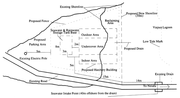 The proposed hatchery site covers approximately 375 m2 between the existing road at the northwest end of Causeway and the southwest end of Kafoa; clearing area of 250 m2 with wire-fenced; reclaiming 160 m2; hatchery concrete slab floor area 80 m2 (10m × 8m); outdoor culture area 24 m2 (3m × 8m); undercover culture area 32 m2 (4m × 8m); indoor microalgae culture room 15 m2 (3m × 5m); indoor pump and equipment room 9 m2 (3m × 3m); elevated seawater and rainwater storage tank base area 24 m2 (3m × 8m); and parking area or future office block area 45 m2 (5m × 9m). Required equipment and materials for the construction and operation of the above hatchery were examined and additional items are presented in Appendix 6.