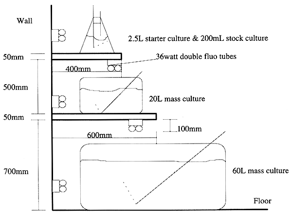 Considering the spawning season in Vava'u, which begins from early summer (November) until March, the first spawning and larval run should be started from November-December, and hatchery produced spat should be transported to ocean nursery farm(s) well before the wet season, preferably before January-March. During the hatchery construction, broodstock can be collected before the spawning season (August-October) by the Fisheries Department staff from existing farms or by local divers. Having cleaned the fauling off, broodstock can be held at the farm near the proposed hatchery until spawning induction. Master stock culture (monospecific, axenic culture) of microalgae can be purchased from CSIRO Marine Laboratories, Tasmania (Australia) and brought by air-freight accompanied by an hatchery expert from Australia. These microalgae will be cultured aseptically in the proposed hatchery, then mass culture can be conducted for feeding pearl oyster larvae, which is estimated to take at least 4 weeks. The hatchery produced spat will be transferred to ocean nursery culture after 6 weeks of hatchery tank culture period.