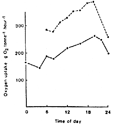 Plus encore, la consommation d'oxygène est variable au long de la journée (Annexe 4) et dépend principalement de l'activité alimentaire des poissons. Une distribution rationnelle d'aliments (rationnement) pendant le jour réduira la consommation instantanée de l'oxygène.