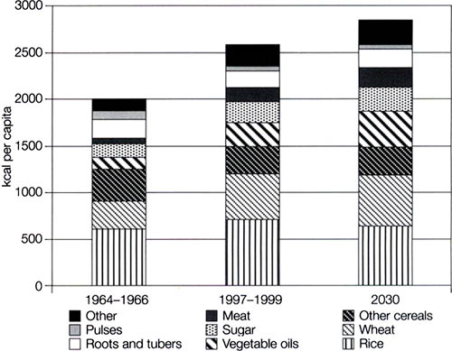 Oil crops have seen the fastest increase in area of any crop sector, expanding by 75 million hectares between the mid-1970s and the end of the 1990s, while cereal area fell by 28 million hectares over the same period. Future per capita consumption of oil crops is expected to rise more rapidly than that of cereals. These crops will account for 45 out of every 100 extra kilocalories added to average diets in developing countries between now and 2030.