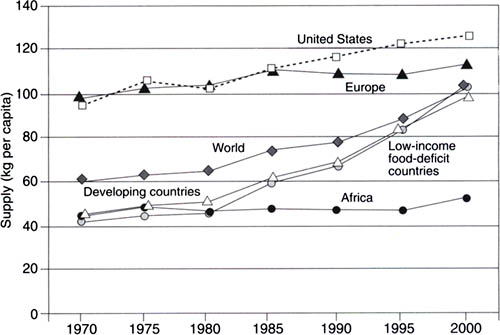 Food consumption expressed in kilocalories (kcal) per capita per day is a key variable used for measuring and evaluating the evolution of the global and regional food situation. A more appropriate term for this variable would be national average apparent food consumption since the data come from national Food Balance Sheets rather than from food consumption surveys. Analysis of FAOSTAT data shows that dietary energy measured in kcals per capita per day has been steadily increasing on a worldwide basis; availability of calories per capita from the mid-1960s to the late 1990s increased globally by approximately 450 kcal per capita per day and by over 600 kcal per capita per day in developing countries (see Table 1). This change has not, however, been equal across regions. The per capita supply of calories has remained almost stagnant in sub-Saharan Africa and has recently fallen in the countries in economic transition. In contrast, the per capita supply of energy has risen dramatically in East Asia (by almost 1000 kcal per capita per day, mainly in China) and in the Near East/North Africa region (by over 700 kcal per capita per day).