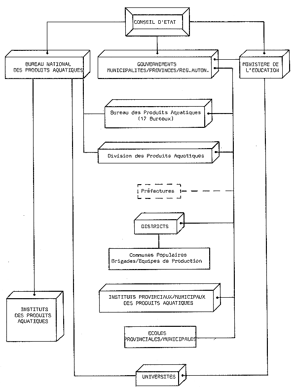 A l'échelle nationale, l'administration centrale de l'aquaculture - et des pêches en général - dépend du Bureau National des Produits Aquatiques (BNPA) de Beijing depuis 19781. Ce Bureau, dirigé par un Vice-Ministre, est directement responsable, vis-à-vis du Conseil d'Etat, de la politique de développement piscicole, des programmes de recherche piscicole (Chapitre 4), ainsi que des aspects techniques de l'enseignement et de la formation piscicoles en collaboration avec le Ministère de l'Education. Le Tableau 12 résume schématiquement ces responsabilités. Le Bureau National des Produits Aquatiques dont le personnel s'élève à environ 400 personnes, se subdivise à cet effet en 10 Départements comme suit: Pêches Maritimes, Pêches Continentales, Science/Education, Planification/Finances, Constructions d'investissement, Matériel, Equipements de pêche, Achats/Commercialisation, Administration des pêches, et Affaires Etrangères (Zu De-Shan, 1980). Le Département des Pêches Continentales a la responsabilité technique du développement de l'aquaculture continentale.