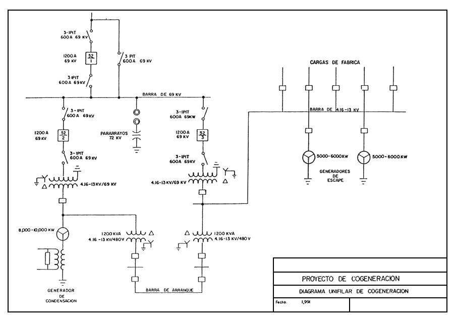 Se presenta como ilustración un diagrama unifiliar del proceso de cogeneración en el ingenio, el cual constituye un elemento de análisis técnico que no entraremos a detallar. (Figura No 2)