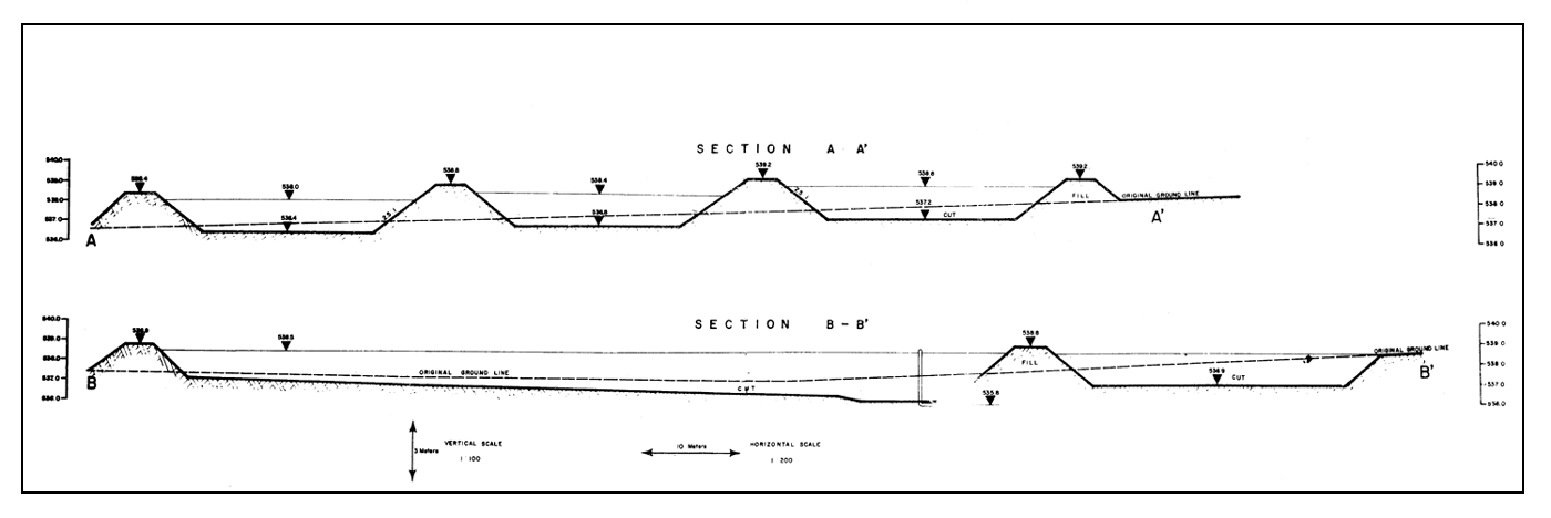 Figure 4 Cross-sections of proposed ponds at Pirassununga (cross-sections a-a', b-b')
