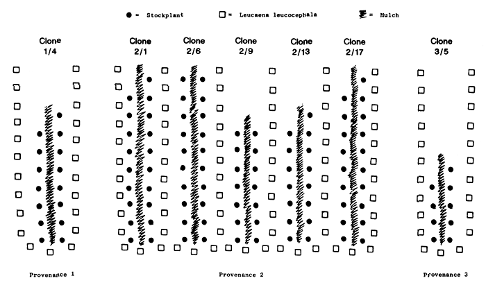 Leguminous shrubs, such as Flemingia rhodocarpa, which is used in stockplant areas for Robusta coffee, and those that cast a moderate shade, like Leucaena. Acacia, Delonix, Cassia, Erythrina, Gliricidia, Parkia, Prosopis and Sesbania could also be tried.